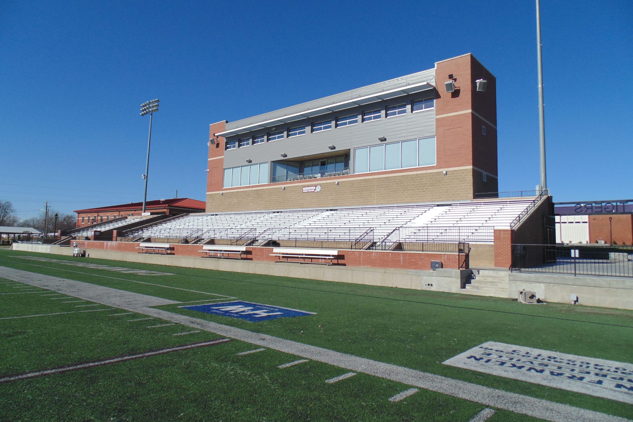 This new Press Box includes 12,218 square feet of Concessions on the ground floor, classrooms on the second, a Presidents Suite and Booster seating on the third floor and Coaches boxes, camera positions, TV studio and Broadcast Studio on the fourth floor. The structure is load bearing masonry with brick veneer and masonry accents to match surrounding buildings.